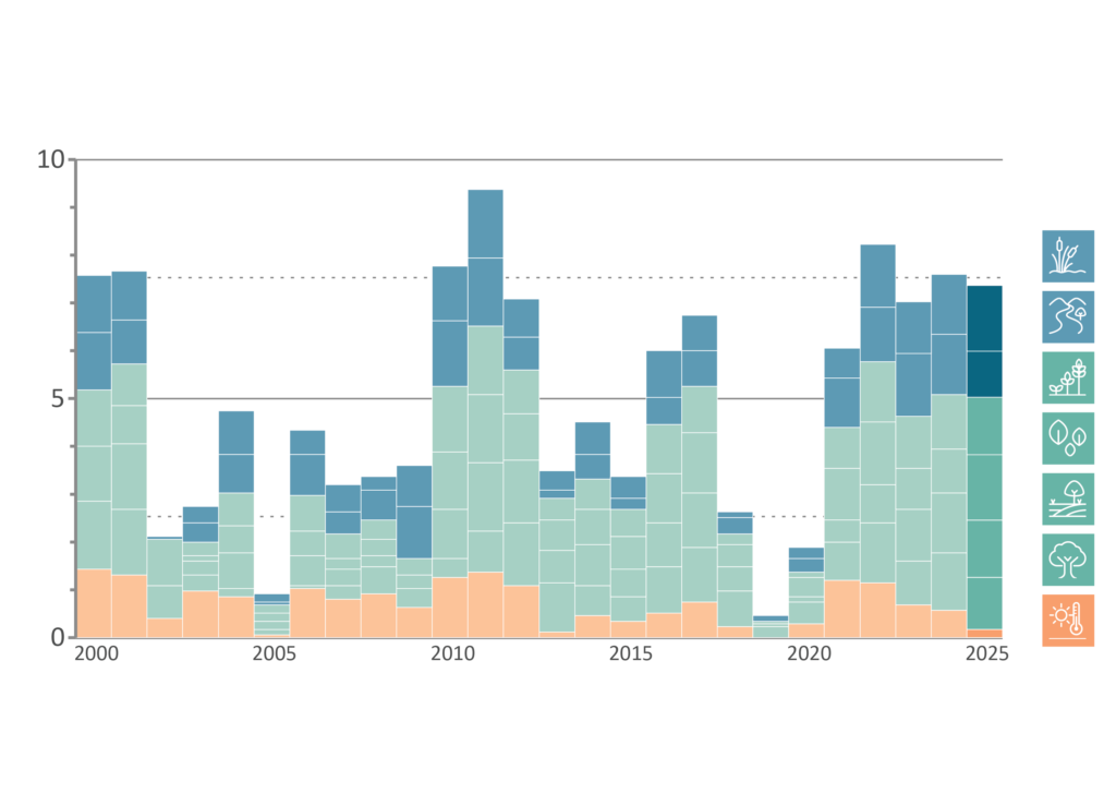 Australia’s environment had an above-average year in 2025, with good rainfall across much of the country, improving soils and vegetation, and progress in environmental management. However, climate change is inflicting serious and accelerating damage on marine ecosystems and driving more species toward extinction. Over the course of 2025 a further 39 species were added to Australia’s List of Threatened Species, bringing the total number of threatened species to 2,175.