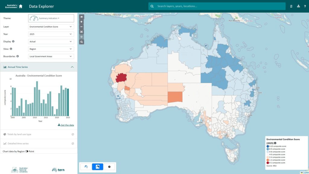 To produce the Australia’s Environment report and data explorer, ANU analyses vast amounts of long-term measurements from satellites, weather stations, river gauges and ecological surveys algorithms and prediction models, including many delivered by NCRIS-enabled projects, including TERN. The results allow patterns of change in Australia’s ecosystems to be assessed, which is critical to understanding and managing our environment. These results are summarised with a score between zero and ten, which provides a relative measure of how favourable conditions were for nature, agriculture and the Australian quality of life, compared to all years since 2000.