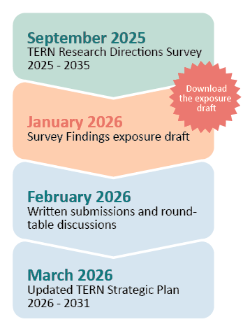 As we prepare to incorporate the survey findings into the TERN Strategic Plan 2026-2031, we would love to keep you and the community engaged. Indeed, this Exposure Draft is an opportunity to check our interpretation of the survey responses and an invitation for further feedback from the research community. Do the priorities identified in the Exposure Draft reflect what you are seeing across terrestrial ecosystem science in Australia? Where would coordinated investment deliver the