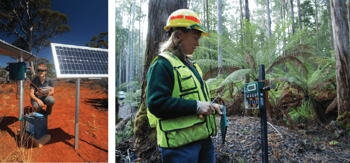 TERN has installed remotely controlled bioacoustic sensors at 21 sites across our nation-wide collaborative research infrastructure, including at research SuperSites at the Great Western Woodlands in WA (left) and the Tasmanian Wilderness World Heritage Area (right) (images courtesy of Suzanne Prober and Tim Wardlaw)